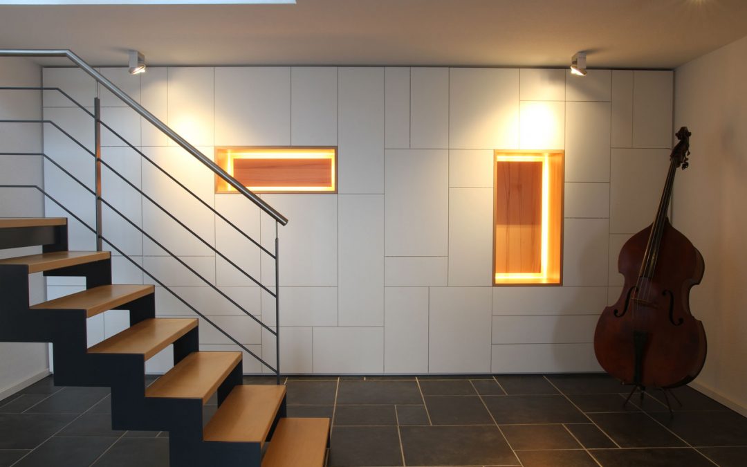 Tetris Weiß mit Massivholzelementen aus Kernbuche. Rückwände mit LED...
