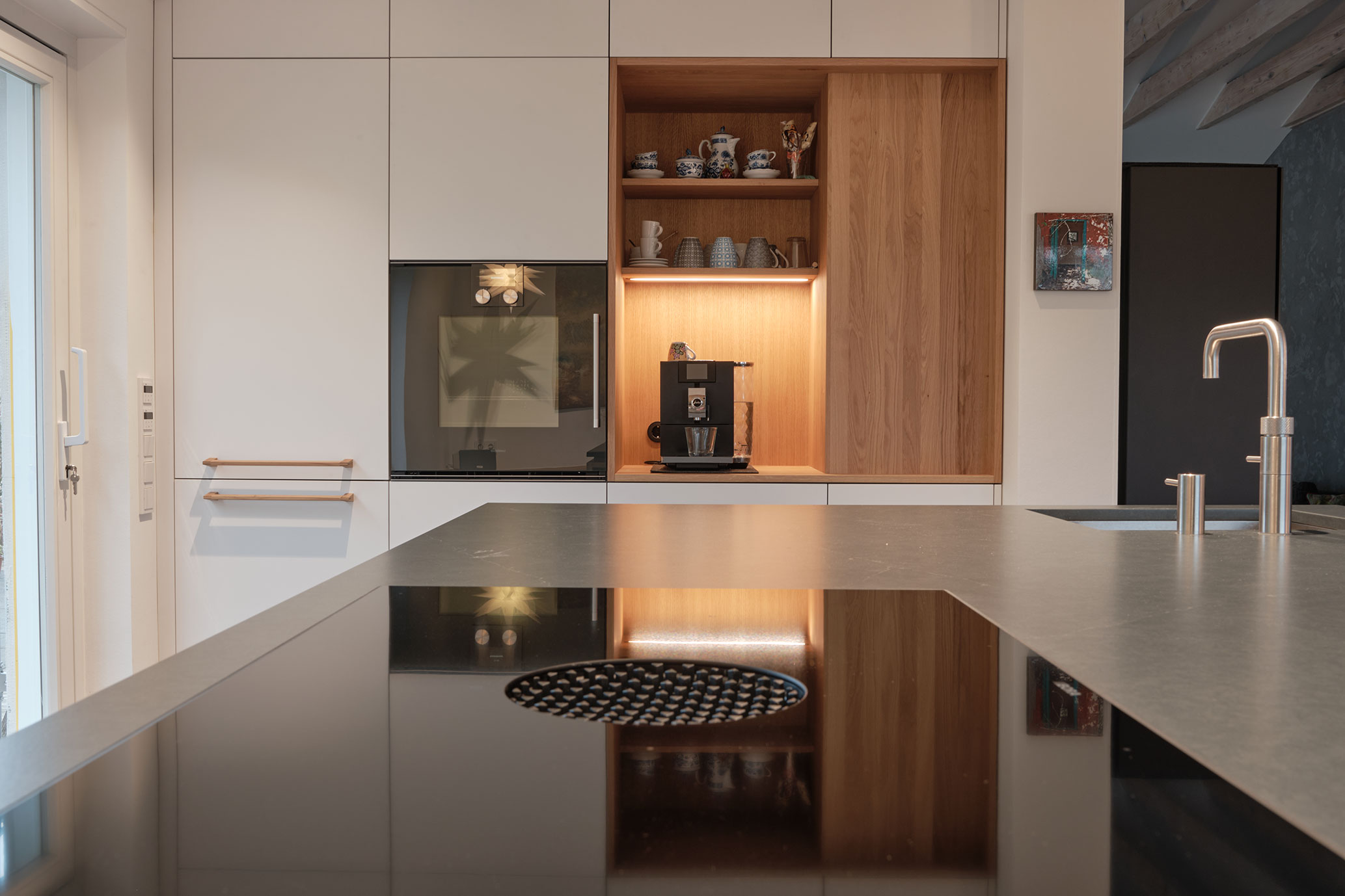 Küche Linoleum Oberfläche: Linoleum und Weißlack Arbeitsplatte: Silestone Kochfeld: Bora PUR X Elektrogeräte: Gaggenau und Miele Wasserstelle: Quooker